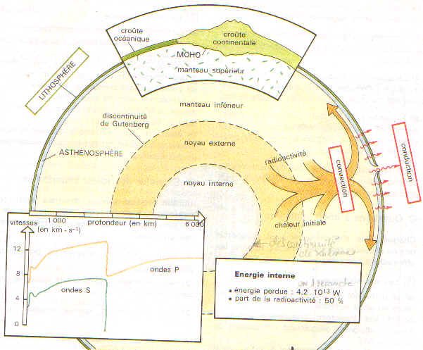 Restitution organisée des connaissances (10 points) Proposition de plan : - Intro : on ne peut forer au centre du globe pour observer la structure du globe. Il faut donc la déduire de nombreuses observations. - L'examen des sismogrammes. Lors d'un séisme, trois types d'ondes arrivent successivement : * les ondes P, primaires, les plus rapides, sont des ondes de compression/dépression, qui de propagent dans les solides, les fluides et dans l'atmosphère, jusque dans les profondeurs du globe. * les ondes S, secondaires, arrivent ensuite. Ces ondes se propagent dans les profondeurs du globe, mais pas dans les liquides. * les ondes L, de grande amplitude, se propagent uniquement en surface. Ainsi, lors d'un séisme, ces ondes arrivent successivement, en partant du foyer du séisme. Les ondes L, qui ne se propagent qu'à la surface, ont une vitesse constante. Au contraire, les ondes P et S ont une vitesse qui croît en fonction la distance de l'épicentre. Comme elle traverse les couches profondes du globe, cela suggère que le globe n'est pas composé d'un seul matériau. On sait que la vitesse des ondes croît lorsque l'onde passe à un milieu de densité plus élevée. En calculant leur vitesse, on peut donc définir la densité des zones plus ou moins profondes du globe, et on peut, à partir de la loi de Descartes, calculer leur trajectoire. A partir de ces mesures, on peut distinguer quatre discontinuités fondamentales : * le Moho : lorsque les ondes P et S arrivent au Moho, leur vitesse augmente. * l'asthénosphère : la vitesse des ondes P et S diminue, ce qui suggère que le milieu est moins dense. * la discontinuité de Gutenberg : alors que la vitesse des ondes P diminue brusquement, les ondes S sont stoppées. Cela suggère que les ondes pénètrent dans un milieu plus ou moins liquide que les ondes S ne peuvent pénétrer. * la discontinuité de Lehman, ou la vitesse des ondes P augmente. On peut également déterminer la profondeur à laquelle se situent ces discontinuités, comme l'a fait Mohorovic pour le Moho : en utilisant la vitesse des ondes, il a pu déterminer la profondeur du Moho à 6 km environ sous les océans, et à 60 km sous les montagnes. On a ainsi pu déterminer la profondeur des autres discontinuités. - Les informations apportées par ces observations sont applicables en tout point de la Terre. Cela suggère donc que la Terre est constituée de couches concentriques. - Les météorites ont également permis de dévoiler la composition probable du globe en fer et silicates. - Enfin, on peut remarquer que plus on descend profond (ex : les mines), plus il fait chaud : la Terre possède donc une énergie interne, qui se manifeste de façon brusque avec les volcans, et permanente avec le flux géothermique. - BILAN : La Terre est constituée de trois couches concentriques : * la croûte terrestre : de 6 km à 70 km, elle a une densité de 2 à 3 environ, et est limitée par le Moho. * le manteau : jusqu'à 2900 km de profondeur, il est constitué de deux couches délimitées par l'asthénosphère entre70 et 200 km : le manteau supérieur et le manteau inférieur. Il est délimité par la discontinuité de Gutenberg. * le noyau : densité de 10 à 13. ° de 2900 à 5100 km : le noyau externe, liquide. ° séparé par la discontinuité de Lehman à 5100 km de profondeur, le noyau interne solide. - Schéma global :